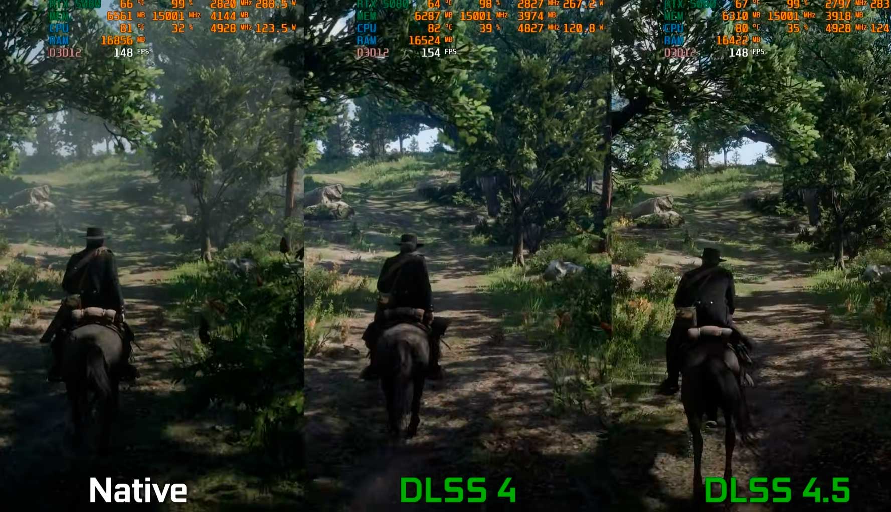 En Red Dead Redemption 2, el cambio es todavía más evidente. La nitidez general, la iluminación y el contraste no solo superan a DLSS 4, sino que en muchos casos se ven mejor que el renderizado nativo. El nivel de detalle en objetos lejanos y la claridad de la imagen hacen que el juego luzca más definido y consistente.