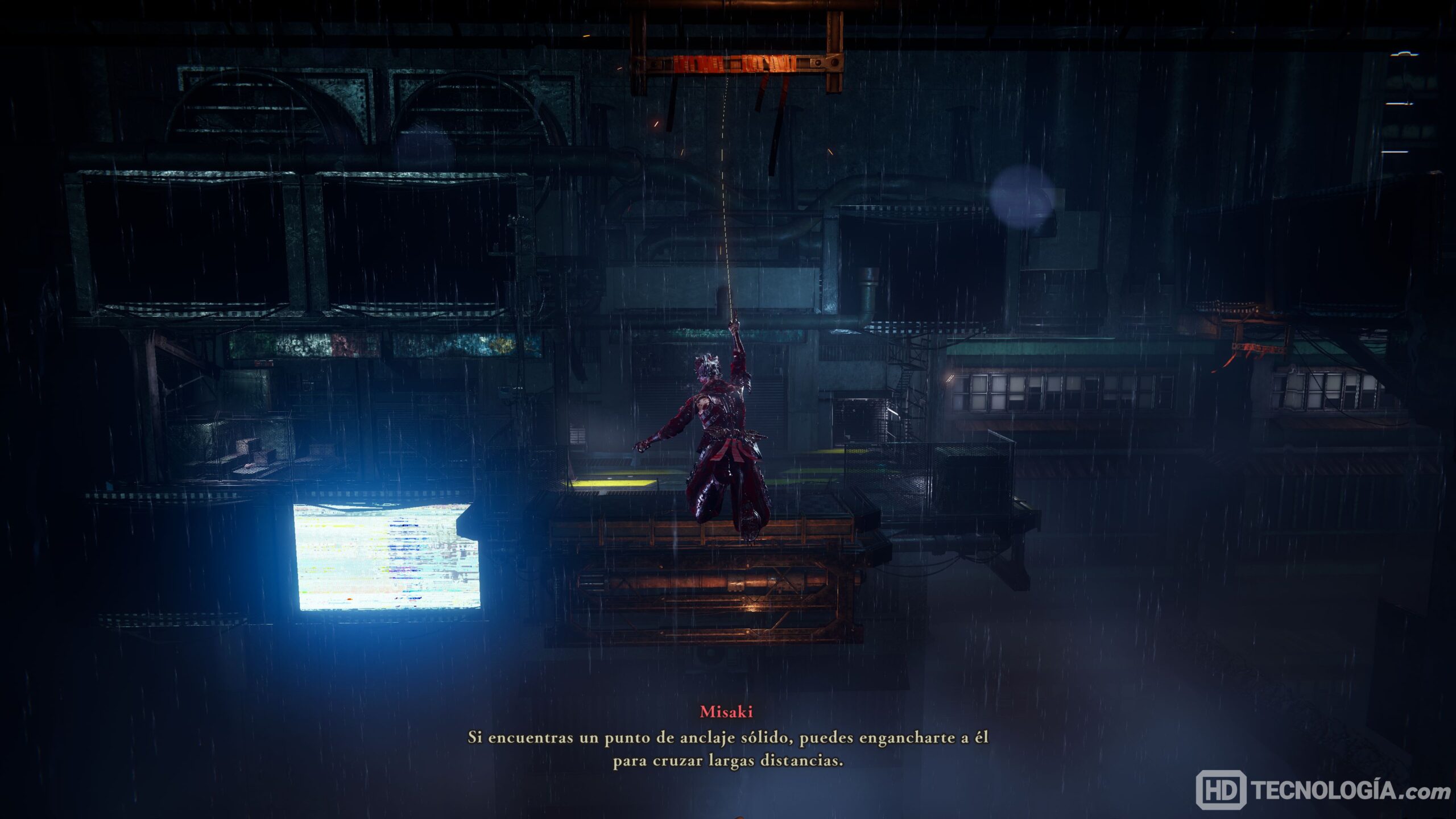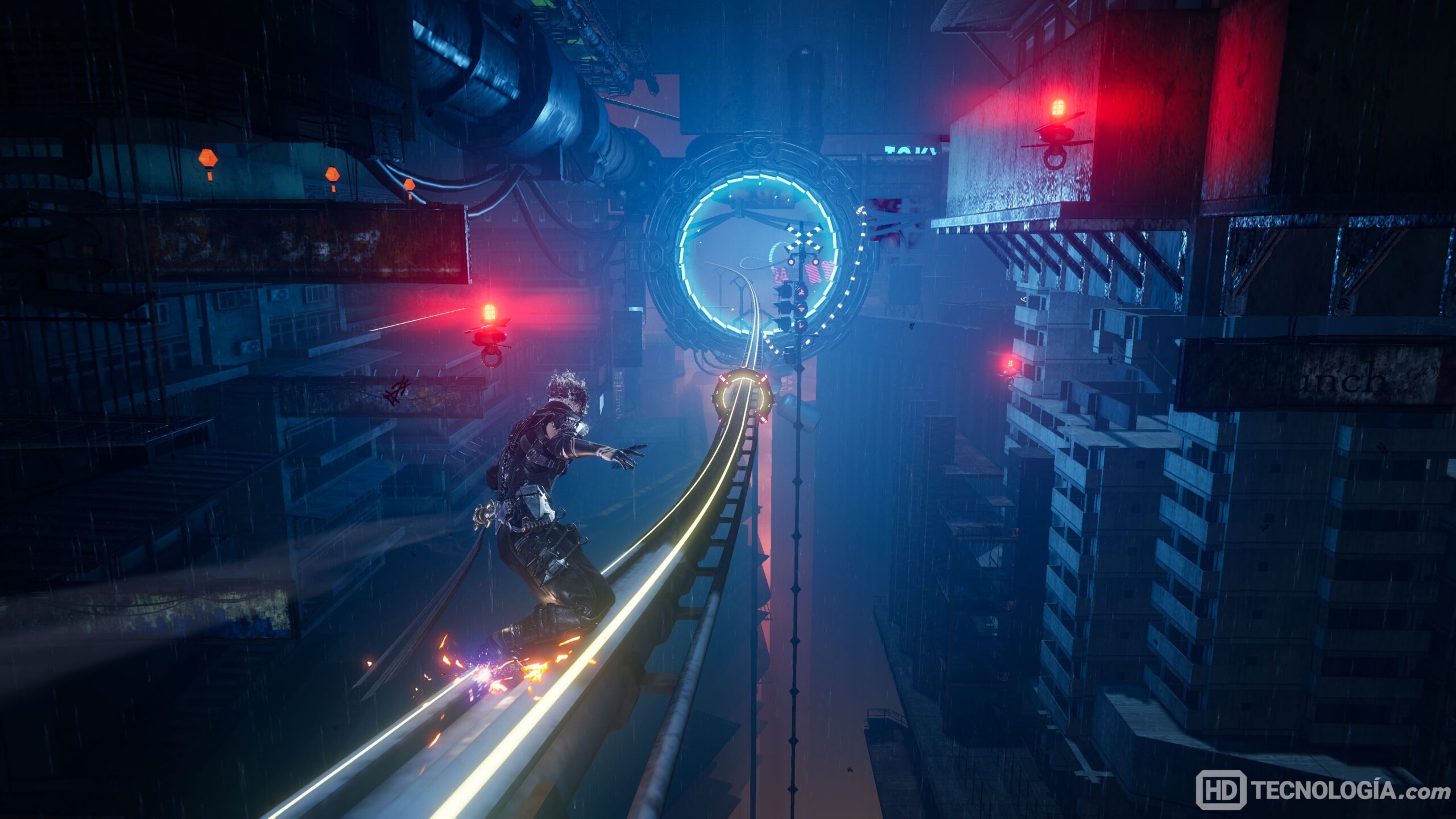 El movimiento es otro punto fuerte. Rápidamente vas sumando herramientas ninjas que amplían las posibilidades, gancho, alas para planear, surf sobre escombros y hasta grindear sobre rieles mientras trenes te rozan la espalda. Algunos tramos combinan todo eso en secuencias que son puro espectáculo, adrenalina, ritmo y precisión quirúrgica.
