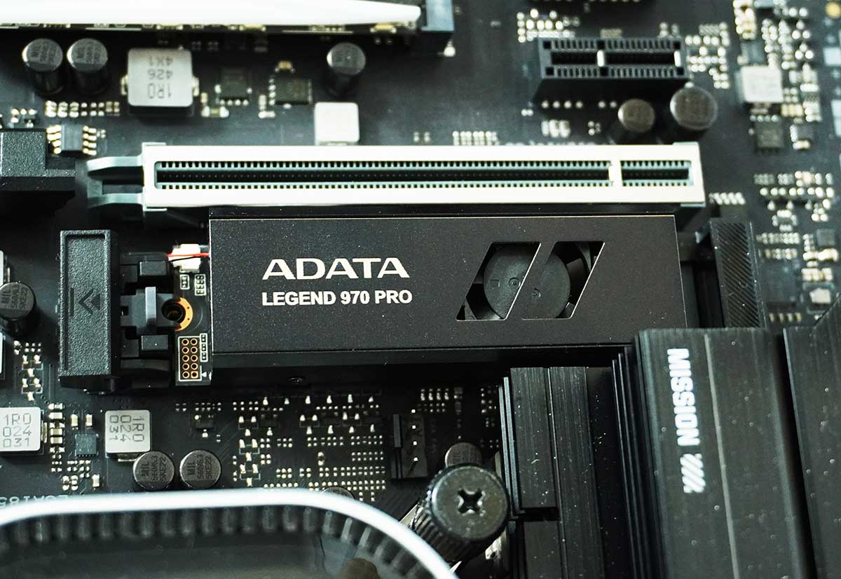 El sistema de refrigeración cuenta con un ventilador integrado. A diferencia de otras unidades Gen 5, no necesita cables adicionales, ya que ADATA desarrolló un sistema que convierte los 3.3 V de la interfaz M.2 a 12 V, usando un controlador step-up que esta en el PCB.