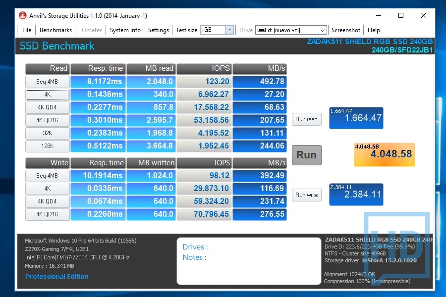 Comenzando con Anvils Storage Utilities obtuvimos un resultado combinado entre lectura y escritura de 4.048.58 puntos, un rendimiento esperado al tratarse de un prototipo en el que el firmware no está finalizado.