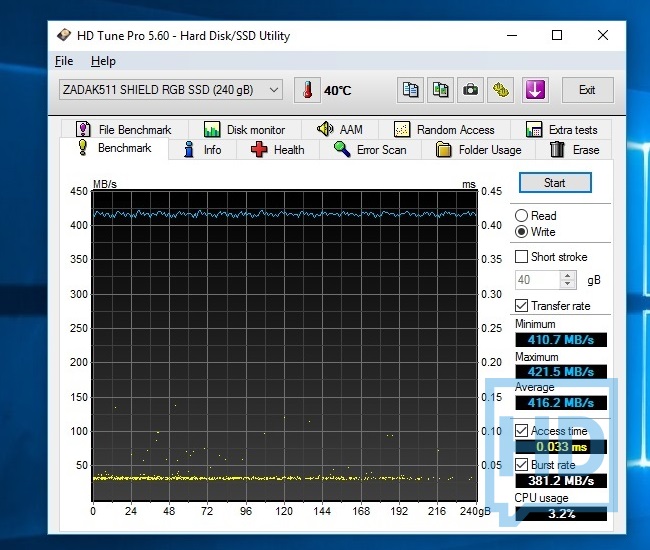 Por último, en HD Tune PRO consiguió un resultado promedio de 416.2 MB/s.